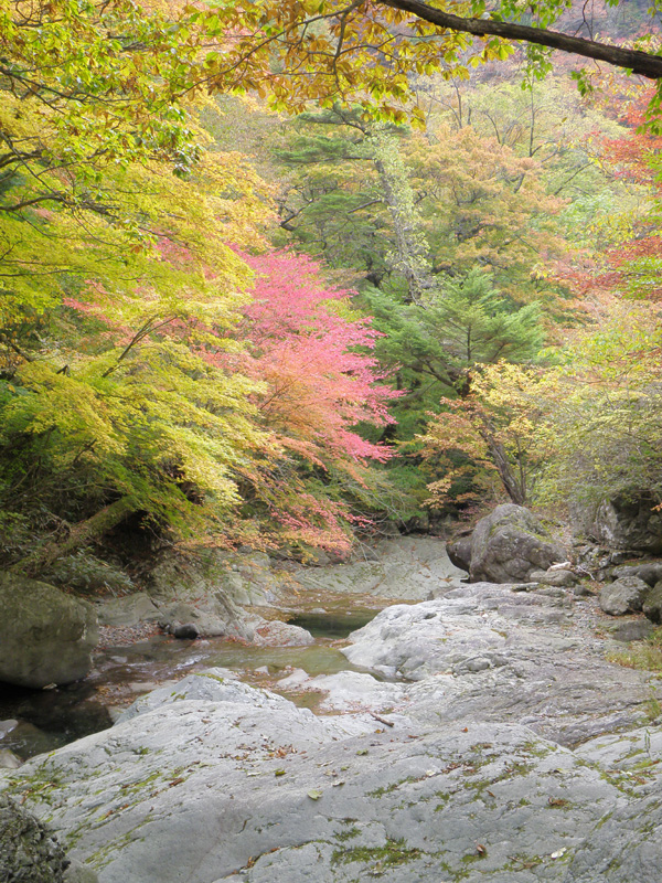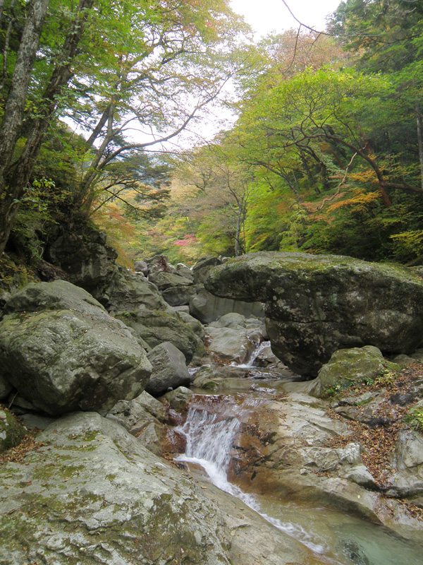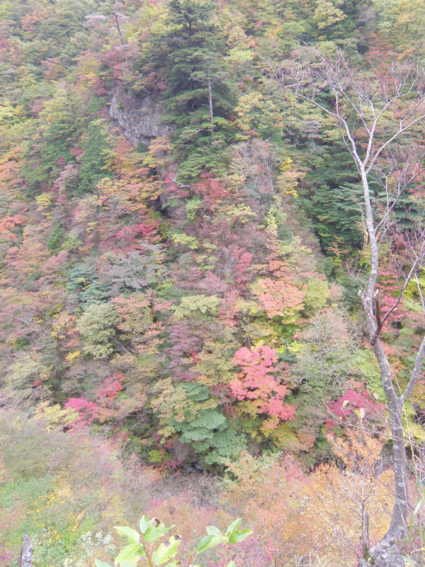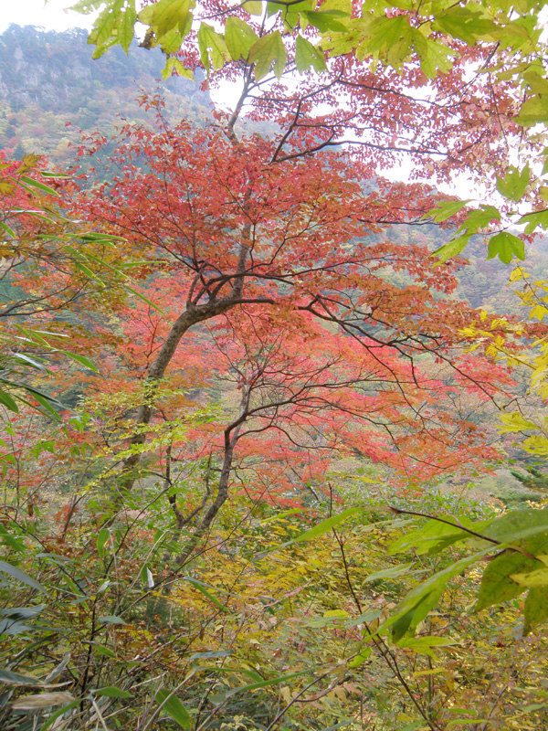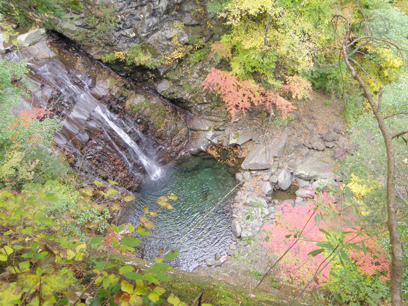 しばらく歩き、上から覗き込むような滝があった。 木々の緑と紅葉の赤、水の緑が神秘的だ。