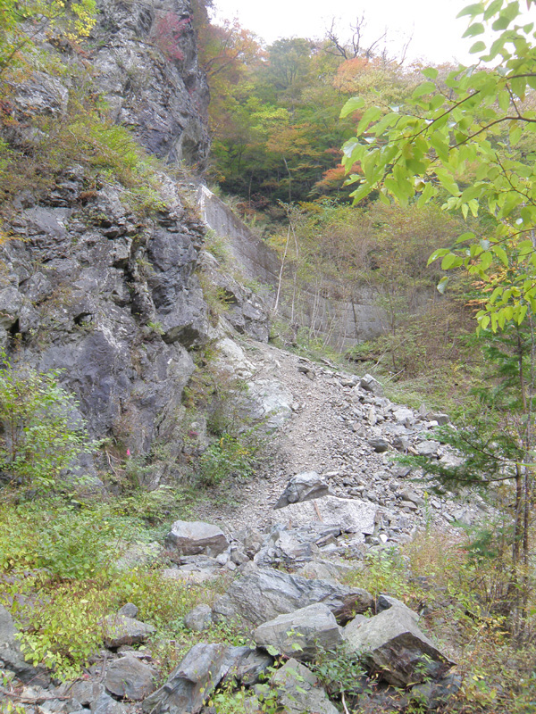 バイクでいけるのはここまでなので、邪魔にならない場所にバイクを止めて、登山の準備をして、徒歩で崩落箇所を通過する。 通過した途端この道だ。