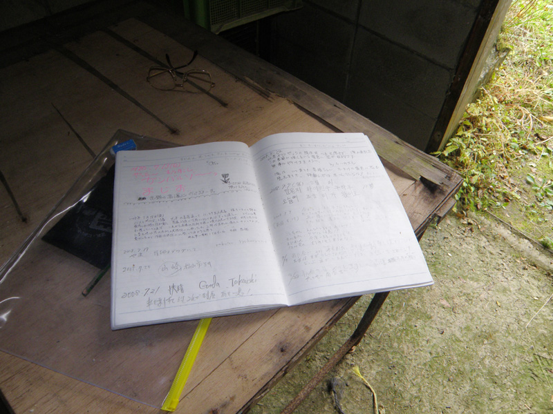 崩落現場を越えてから200mほどで、ようやく登山口入口に到着。 ここまで1時間もかかってしまった。 けっこう遠いなぁ。 距離にして4kmくらいか? 放置されすぎて使う気にならない公衆トイレと、休憩所があった。 休憩所の中に入ってみたら、防水加工されたノートを発見。 中を見てみたら、滝を見に来た人たちの書き込みがあった。 見るだけで書きはしなかったが。