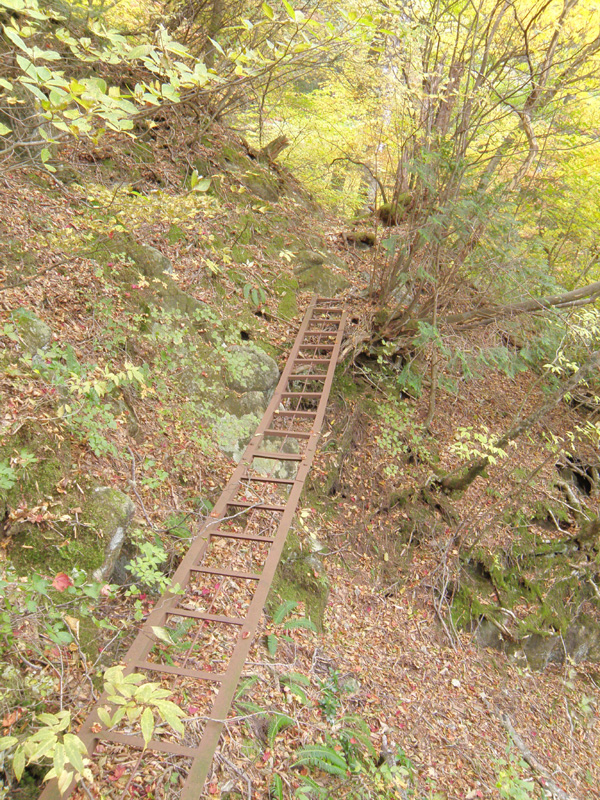 滝の右側にかろうじて残る踏み跡をたどり山の中へ…… ぐんぐん高度を上げていきすぐに滝と同じ高さになった。 こんな怖いはしごもかけられていた。