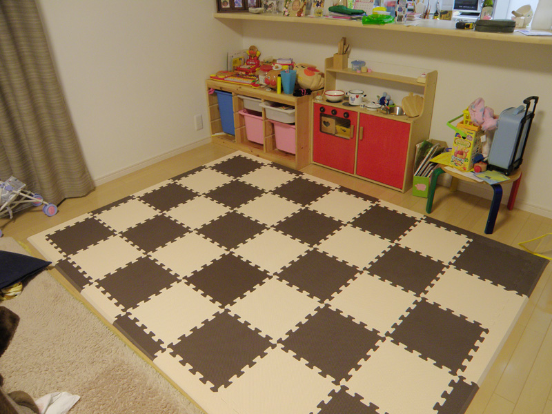 長男がもうじき寝返りしたり、ハイハイしたりするので、床に敷くマットを買ってきた。 次女の時もマットを使ったが、中のパーツが取れるタイプでしょっちゅう取れたり、次女が握って離さなかったり、パーツを紛失したりで、何かと不便だったので、パーツがないタイプを購入。