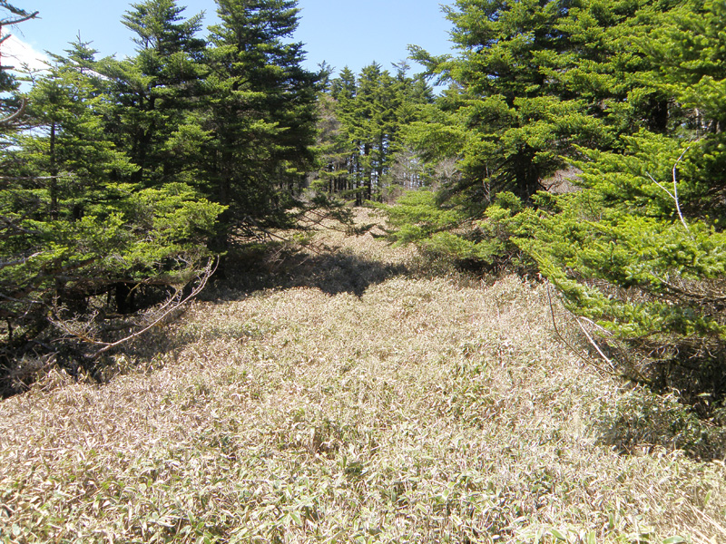 矢筈山への笹原を登っているとき、後ろを振り返ると、今まで歩いてきた道が。 もうこんなに歩いてきたのか。