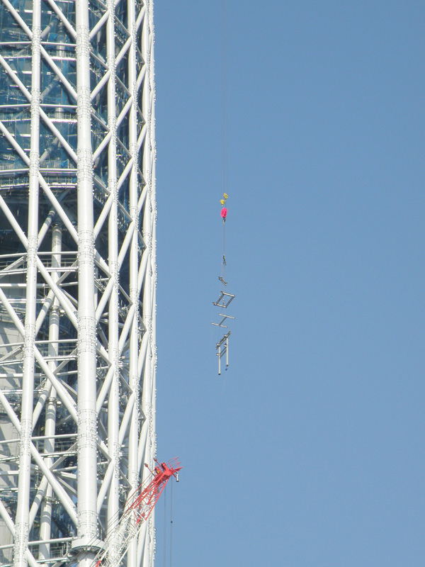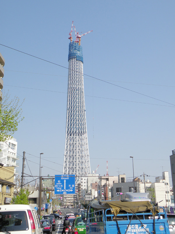 そして気になるスポット「東京スカイツリー」。 日本最大の電波塔になる予定のもので、今は建築中。 2012年春開業目指して工事が進んでいる。 現在の高さは358m。 この時点ですでに日本最大の高さになっている。