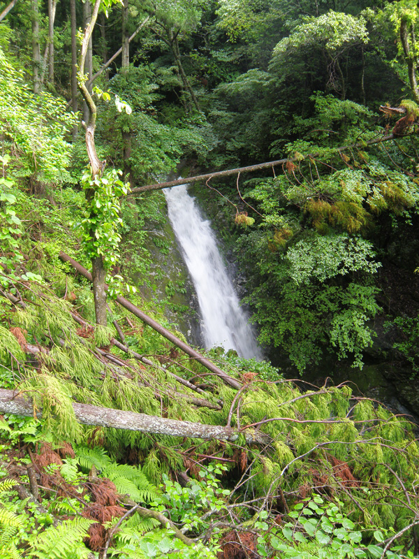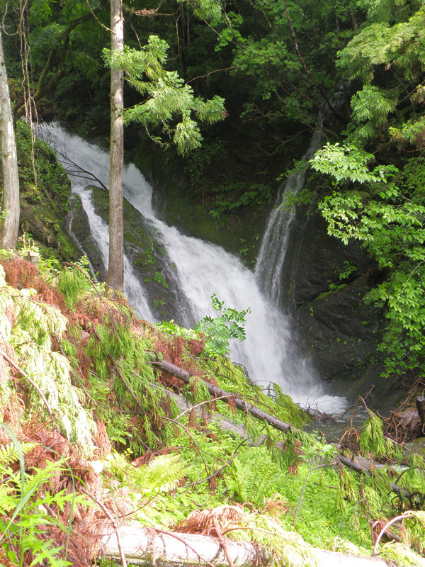 この登り坂がけっこう険しい。 傾斜が凄まじいな。 右手には沢が流れてるのだが、水がすごい。 普段ならチョロチョロしか流れていないのだろう、きっと。 しかし今日は滝が出来ている。