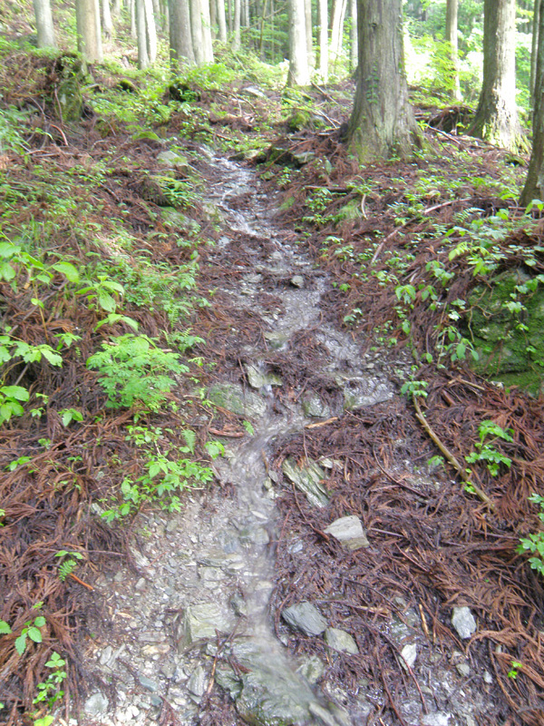 ここからは道もけっこう急になる。 そして登山道に水が流れている。 大雨で行き場を失った水だろうか。 ちょうど登山道は水が流れるにはもってこいだしね。