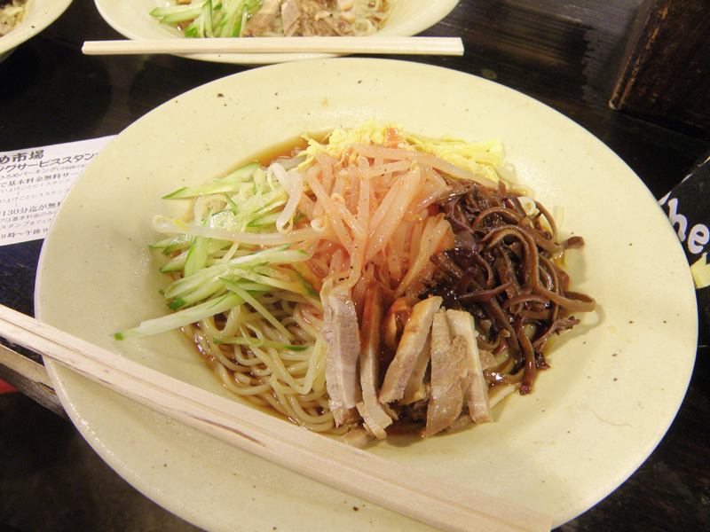 ご飯を販売している店が半分ほどで、好きなところで買って、テーブルで食べることができる見たい。 やはり海産物を取り扱う店が多かったのだが、それは夜食べるので、今は我慢。 暑いので冷麺を食べることにした。
