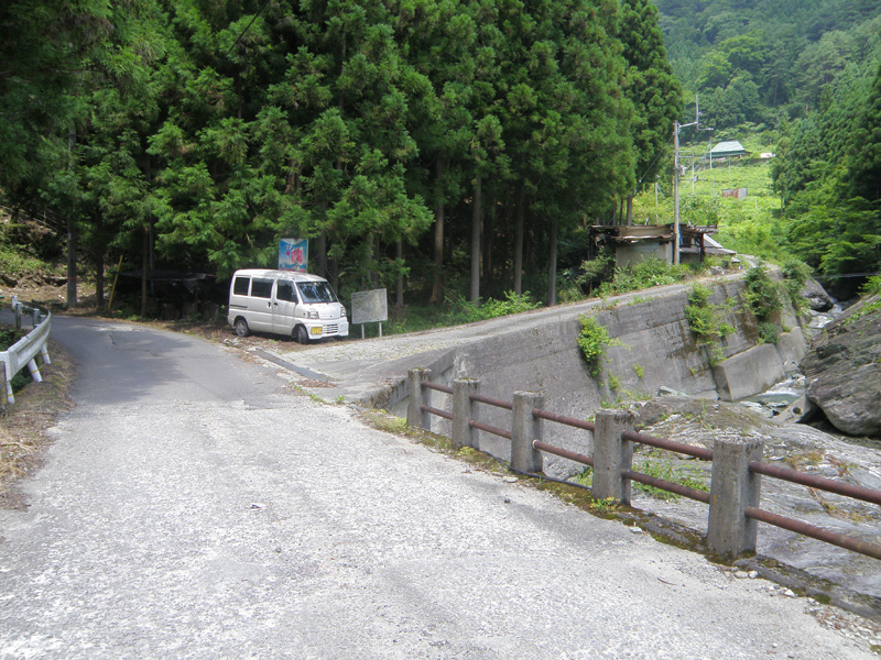 けっこう大きな岩がゴロゴロ転がっている林道で走りにくい。 途中で、川に桟橋の工事か何かをしようとしている老人の集団がいた。 ここまで軽トラで入ってくるとは…… なかなかやるな。