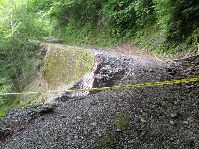 バイクから降りてみてみると、路肩がかなり崩壊している。 車は通れないが、バイクなら余裕で通れそうだ。 しかしこの先に行っても行き止まりらしいし、とりあえずUターン。