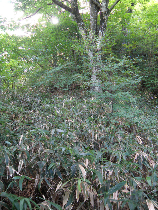 樹林帯の中の道が終わり、笹が大量に出現してきた。 そして道が乏しくなってきた。
