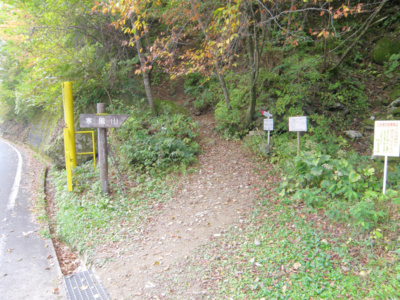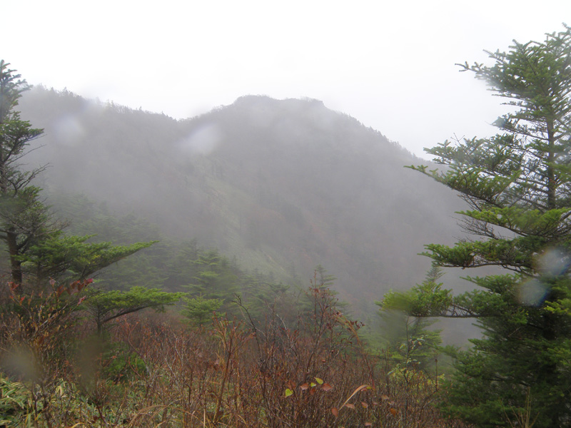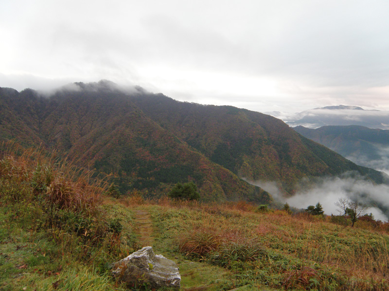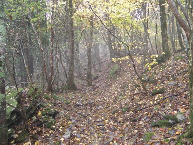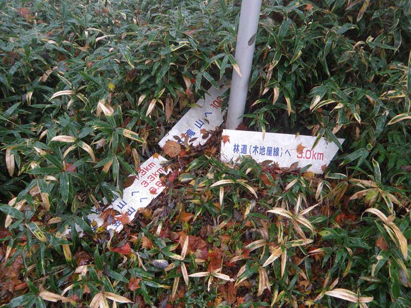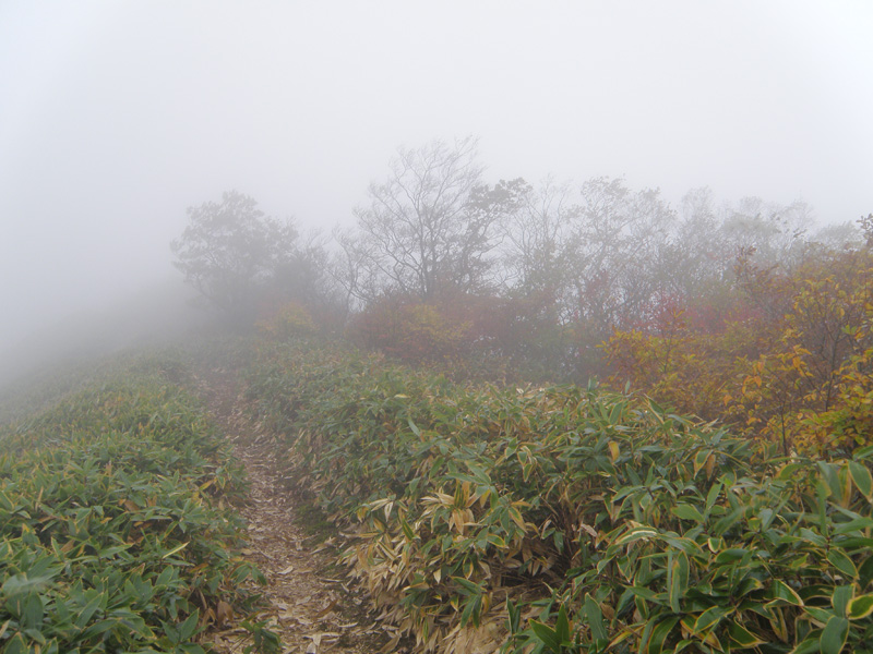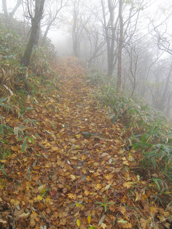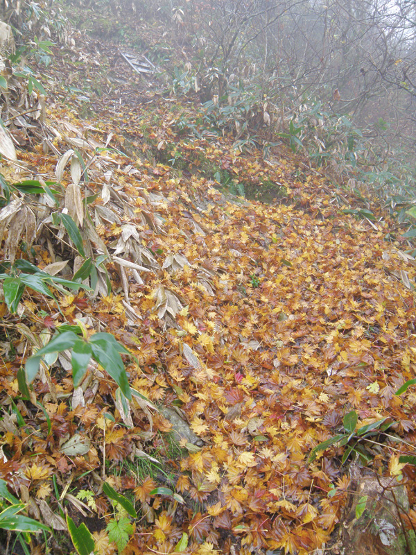 歩くこと15分ほど。 さっきの看板で750mとなっていたので、そろそろ着いてもいい頃だなぁ…… しかし山頂は見えない。 右側は谷。 左側は斜面になっている。 そのまましばらく進んでいくが、突然道が消えた。 明らかに踏み後がない。 50mほど歩くと、左側の斜面の上まで行けそうなので歩いて行ってみるが、そこにも道は無い。 これは…… 7月の寒峰を思い出す……