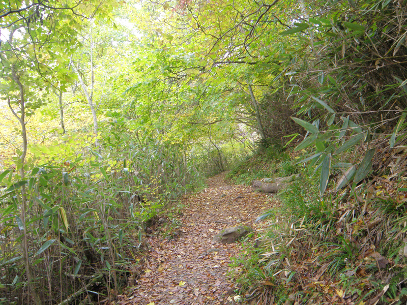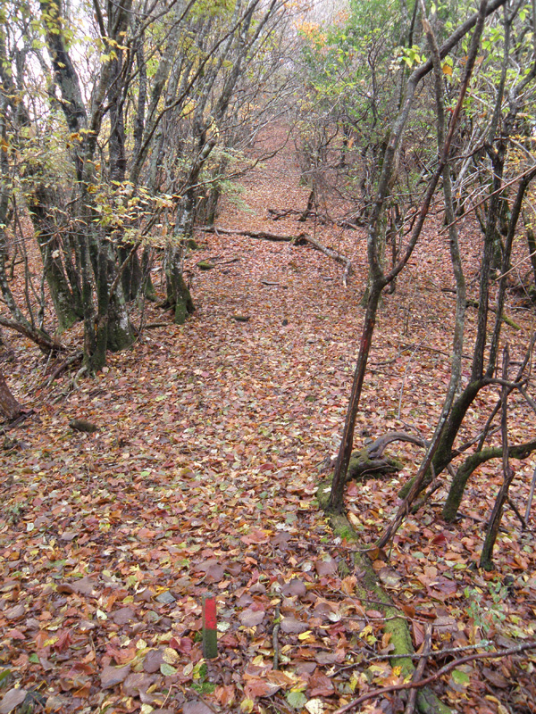 ジネンゴノ頭を越えた後は、笹原の割合が減った気がする。 比較的樹林帯の中だったので、風もおさまっていた。 歩くこと約1時間、「神鳴池」付近で車道に合流。