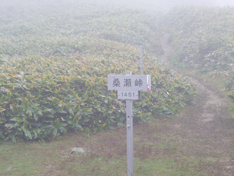50分ほど歩き、桑瀬峠に到着。 樹林帯を抜けてしまったため、すさまじい強風。 雨自体は降っていないが、風の中にだいぶ水分が含まれているので、すぐに濡れてくる。