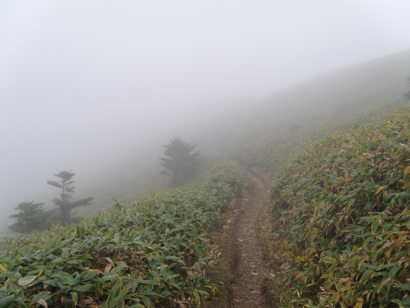 尾根の登りが終わり、一瞬樹林帯の中に入り、伊予富士を正面に見る、笹原の登山道までやってきた。 ここから雄大な伊予富士が見えるはずなのだが…… 目の前には笹原と白い景色のみ。 そして猛烈な風。