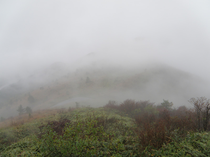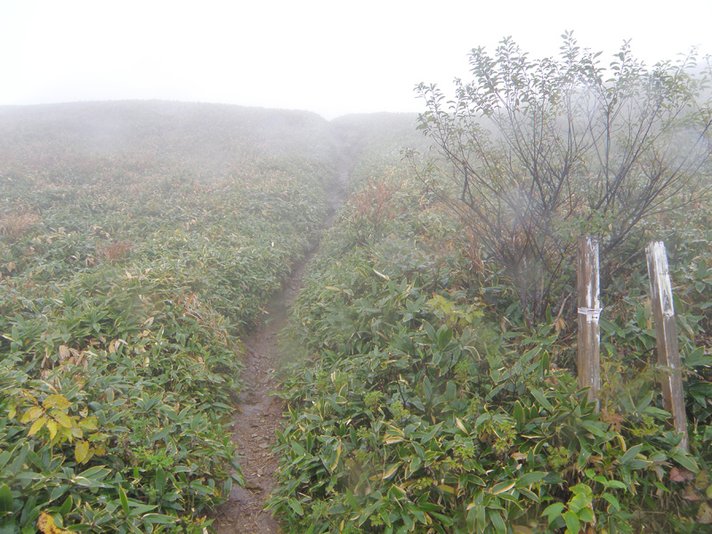 そのまま登山道を歩いていき、西黒森を目指す。 そろそろどこかで休憩をしたいが……風が防げて、できれば雨も防げる場所はないだろうか…… だが、登山道には広い場所が無く、なかなか休む場所がない。 こんな日に誰も登りにこないだろう、と思うので、登山道の真ん中に座ってもいいのだが……