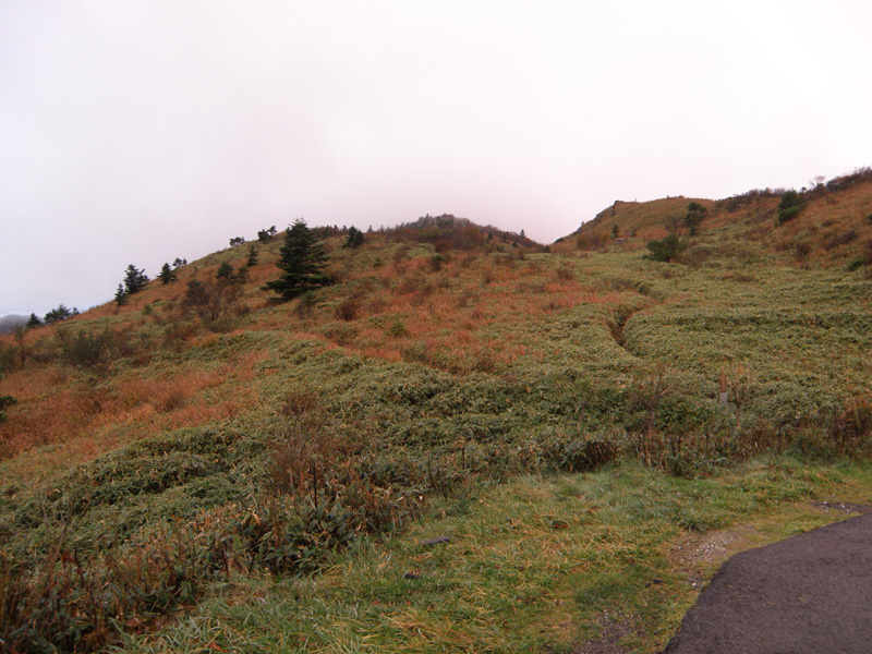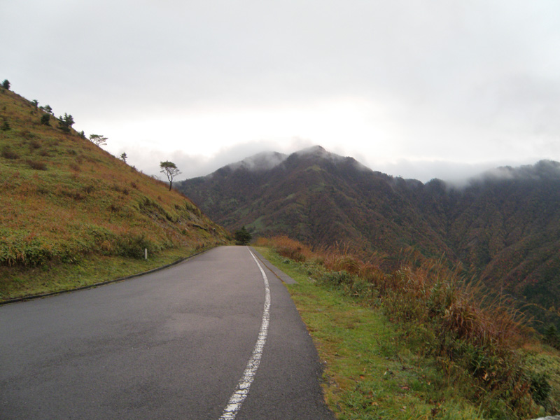 雨の中30分ほどゆっくり休憩し、瓶ヶ森を目指す。 すぐに車道に合流。 そして山頂への最後の登りへ。