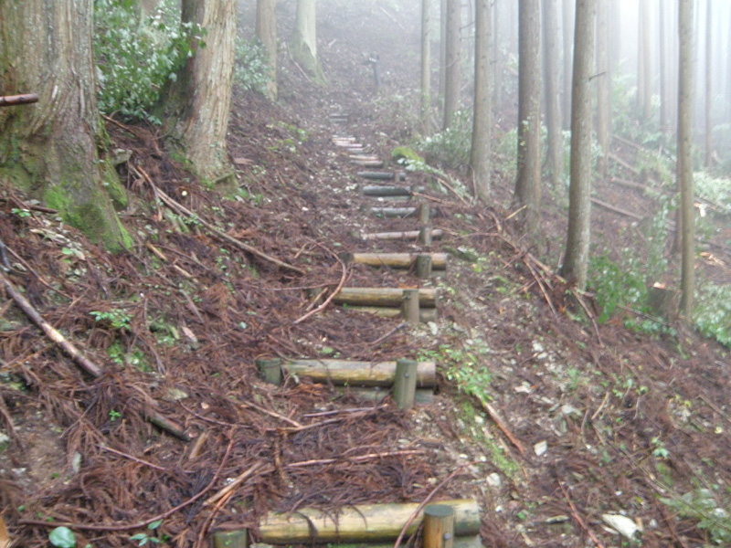 所々、木の階段が整備されているのだが、古くコケが生えている+雨で濡れているのでメチャメチャ滑る。 転倒しないように注意しながら歩く。