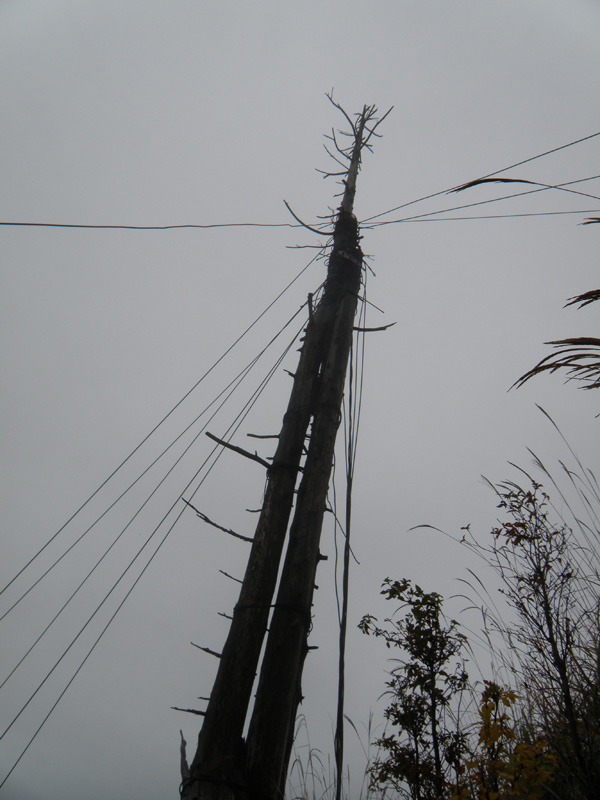 さらに歩いて行くと、不思議なものを発見。 枯れ木がワイヤーで倒れないように固定されている。 なんだ、これ?