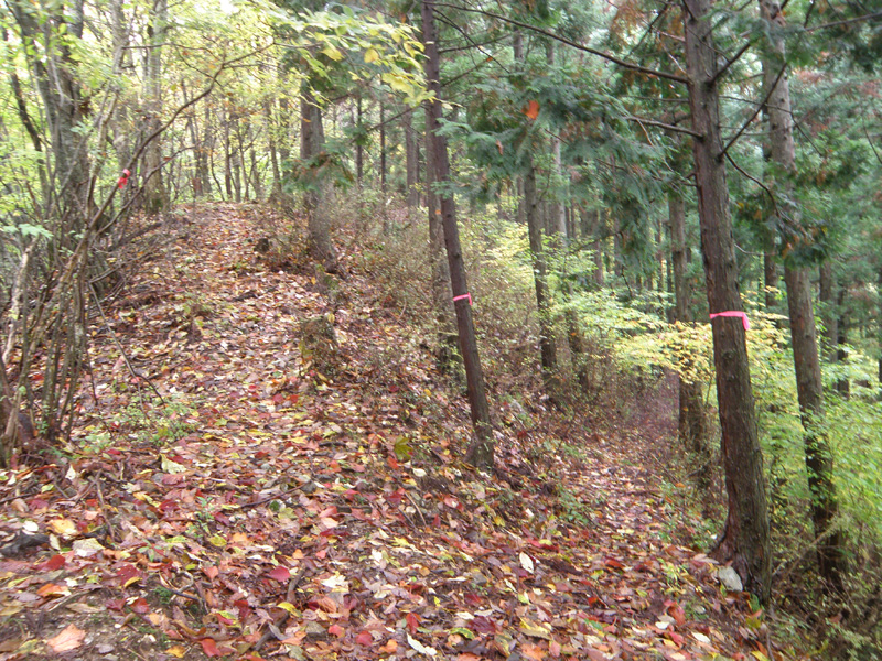 薄いほうの赤テープの道を進んでみるか。 こっちは傾斜がけっこう急で、所々赤テープやピンクテープが巻きつけてある。