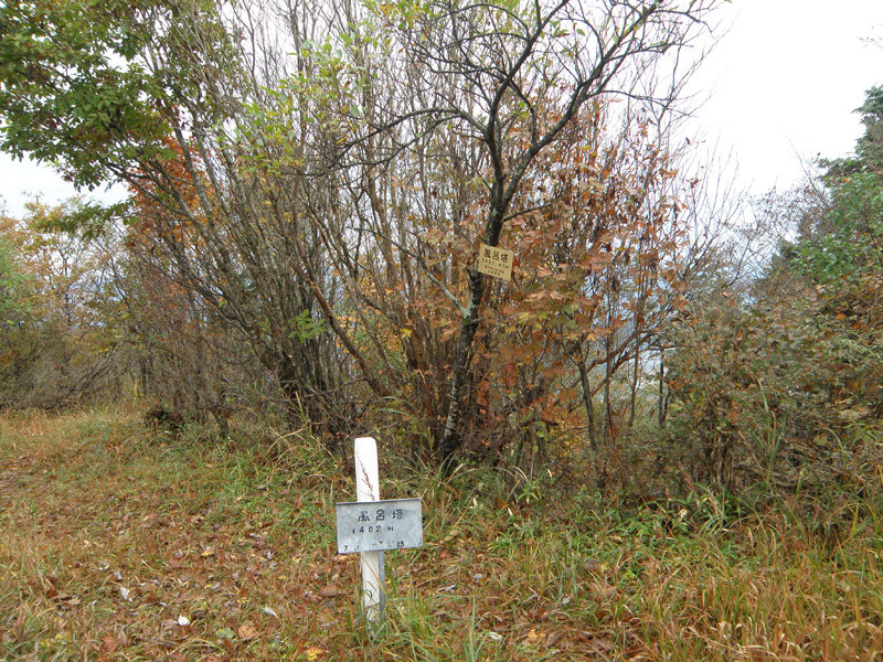 少し進むと風呂塔の山頂に到着。 もう少し展望が良いと思ったのだが、背の低い樹木に囲まれていて、思っていたよりは見えない。