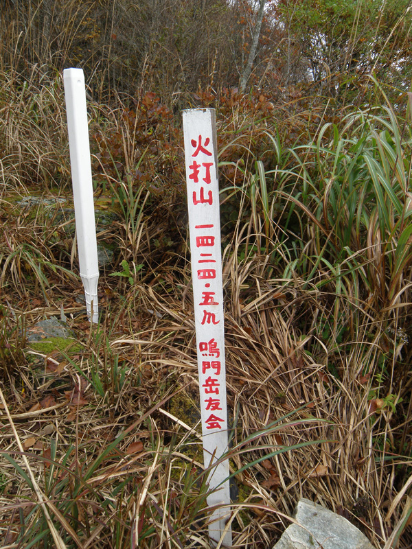 1322m(?)の鞍部に「火打山 1.1km」の案内が。 その直後には、背丈より高い野草地帯。