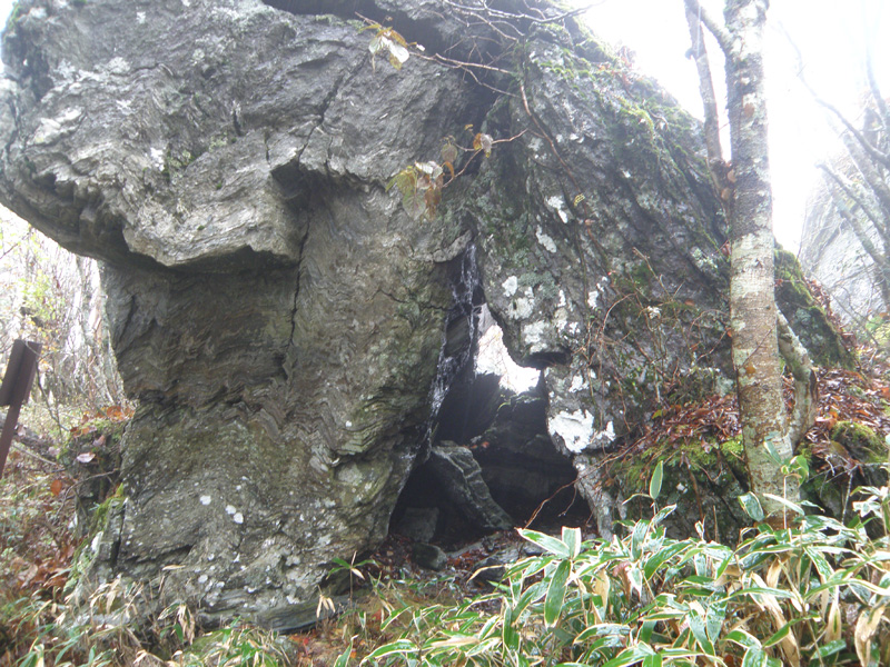 樹林帯の中を歩いていたら、なんとか休憩できそうなスペースと、雨が防げそうな大岩を発見。 この岩に寄りかかって休むか。