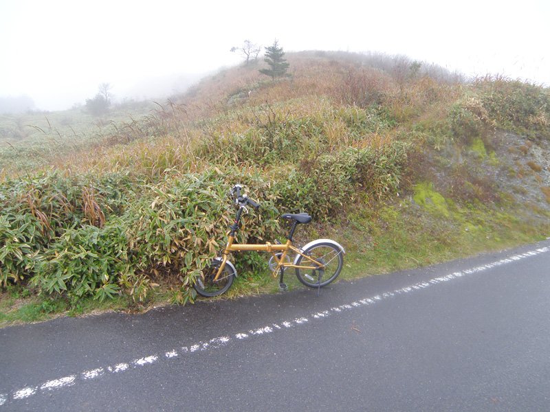 車で走ってるとあまり気付かないが、ここの県道の下りはけっこう急だな。 前後のブレーキを適度にかけてもスピードが出る。 雨だし落ち葉がたくさんなので、こけないようには気を付けなくては……