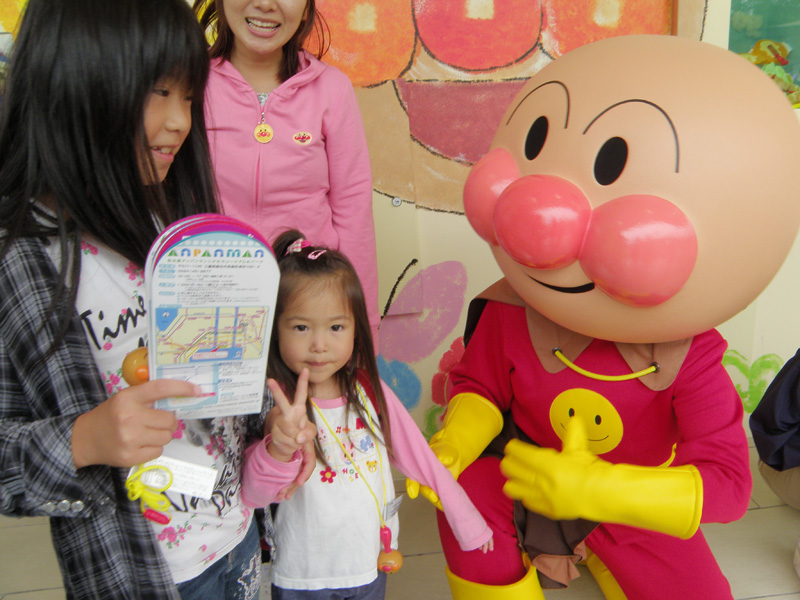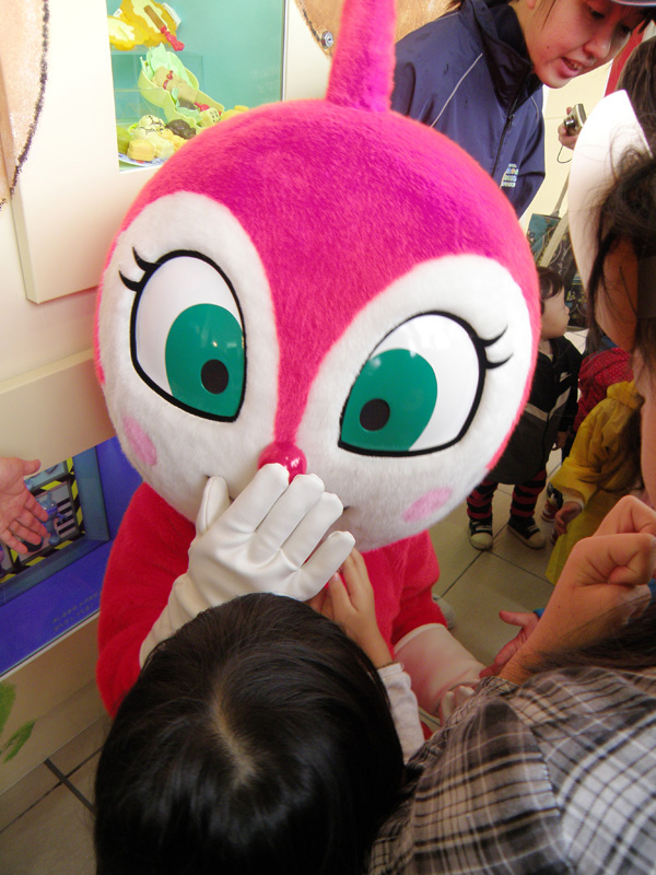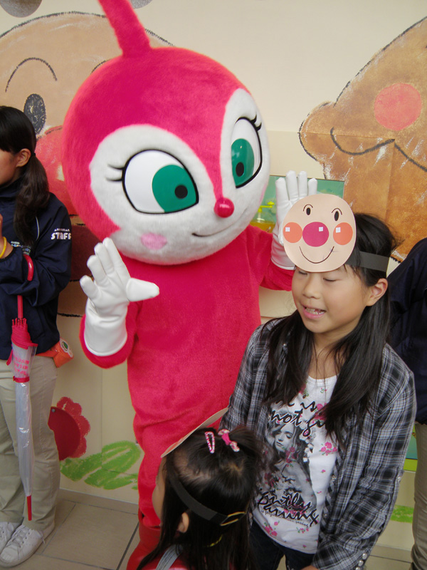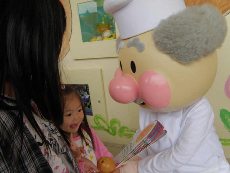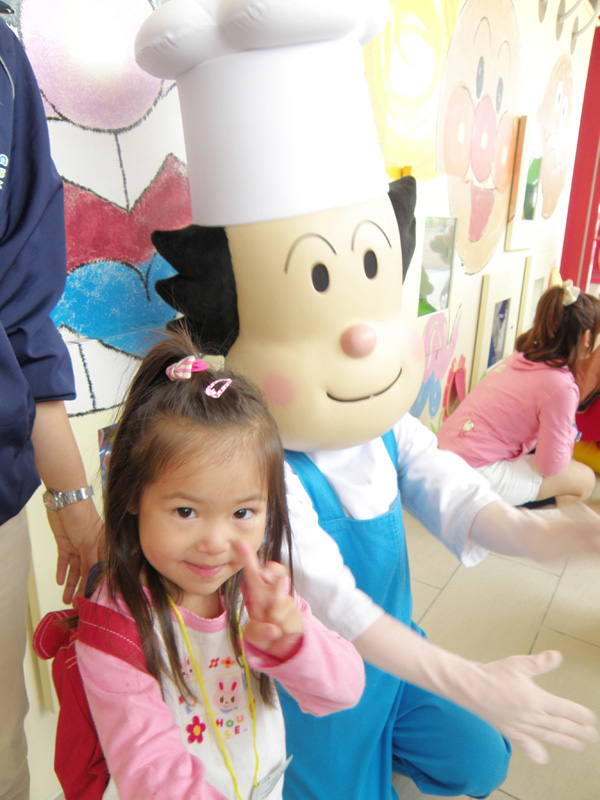 入ってすぐ、アンパンマンとジャムおじさんとバタコさんの着ぐるみが出迎えてくれた。 でかいので次女が怖がるかなぁ、と思ったが、予想に反して次女は大はしゃぎで近づいて行った。 握手してもらったりして、とても喜んでいた。