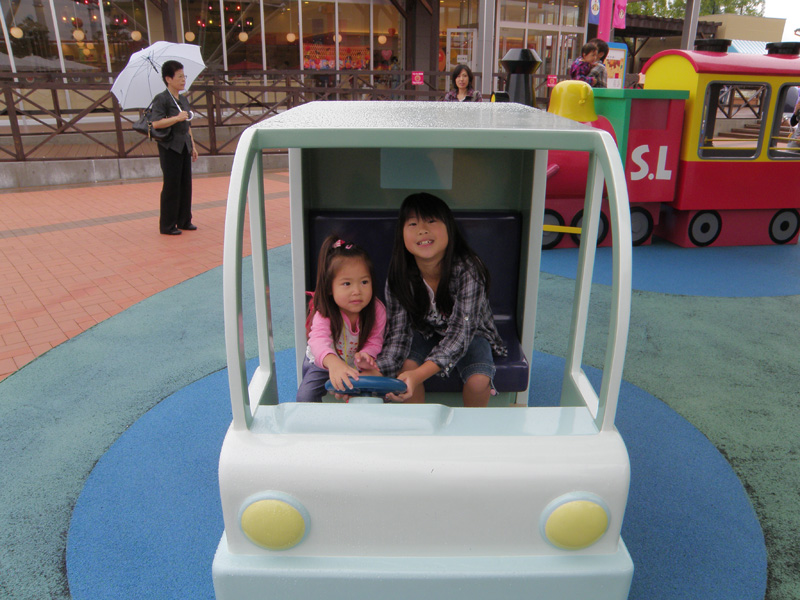 屋根がないエリアだが、アンパンマンの遊具みたいなものを置いてあり、楽しんでいた。 ここ、子供が多いためか、従業員がすごい気を使っていた。 雨が降っているので足元が濡れている。 床は全てモップなどで水を切っていた。 遊具も雨がポツポツ降っているにもかかわらず、全て拭きあげて、座っても濡れないようになっていた。