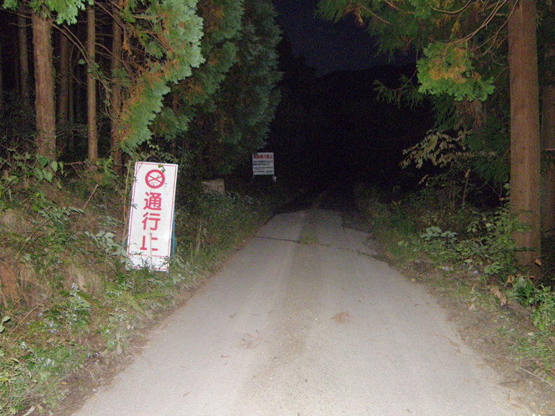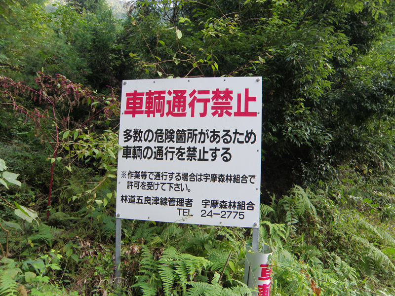 少し走り「林道五良津線」の入口のところに通行止めの看板が…… ネットで調べた情報だと、災害復旧も終了し、東赤石山の登山口まで車で行けるらしいのだが…… この看板を無視して進んで行ったのか? それともその後に設置されたのかは不明。