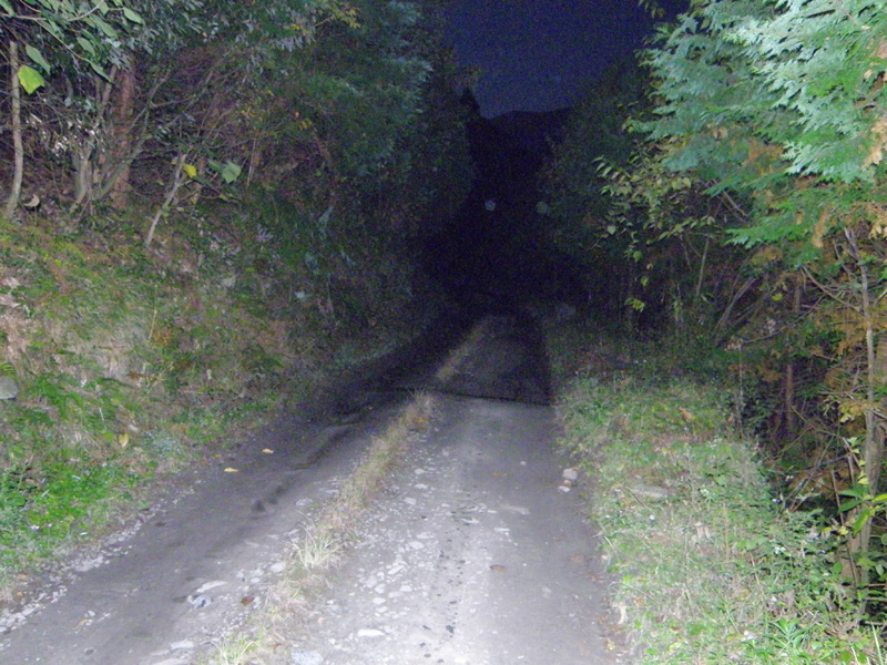 河又まで歩いている途中、左の森の中で何かが光った。 ヘッドランプを向けてみると、目が光っているではないか。 姿がよく確認できないので、近づいてみると、それは猪だった。 何か食べてるのか? オレに気付いたらすごい勢いで逃げて行った。