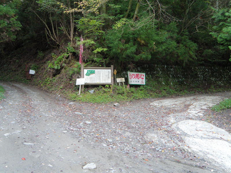 地図で調べておいた、河又方面に行く細い道を走る。 しばらくすると「東赤石山登山口 この先」の看板が出現。