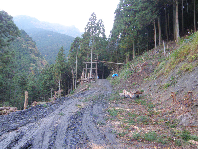 途中、樹林帯の工事をしてる個所があった。 太い木で足場を組んでいる。 樹林帯の工事っぽいな。