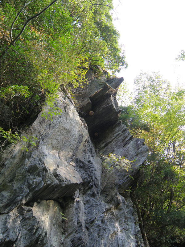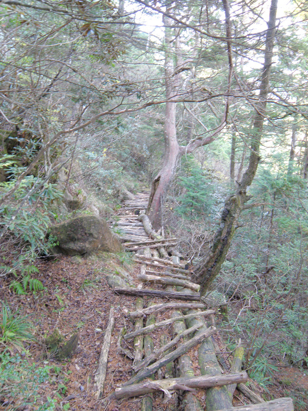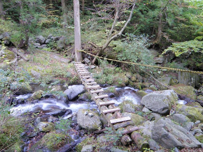 そのまま下山していく。 ところどころにピンクテープや赤テープが張ってあるし、看板もたまに出現するので道を見失うようなところではないだろう。 ただ、木で組まれた橋とかが朽ちていて、折れそうだし、滑りそうだし怖い部分が何箇所か。