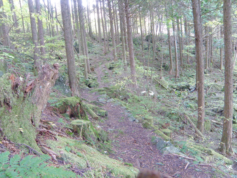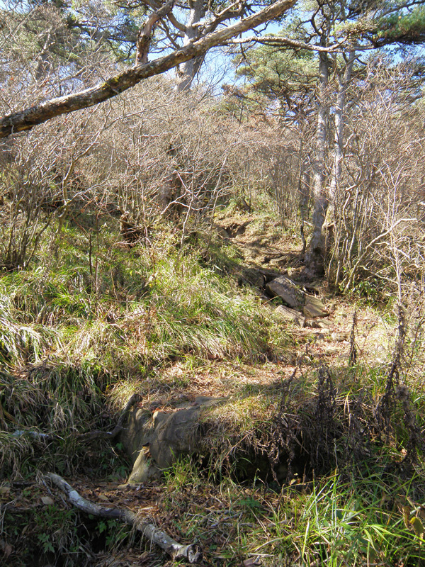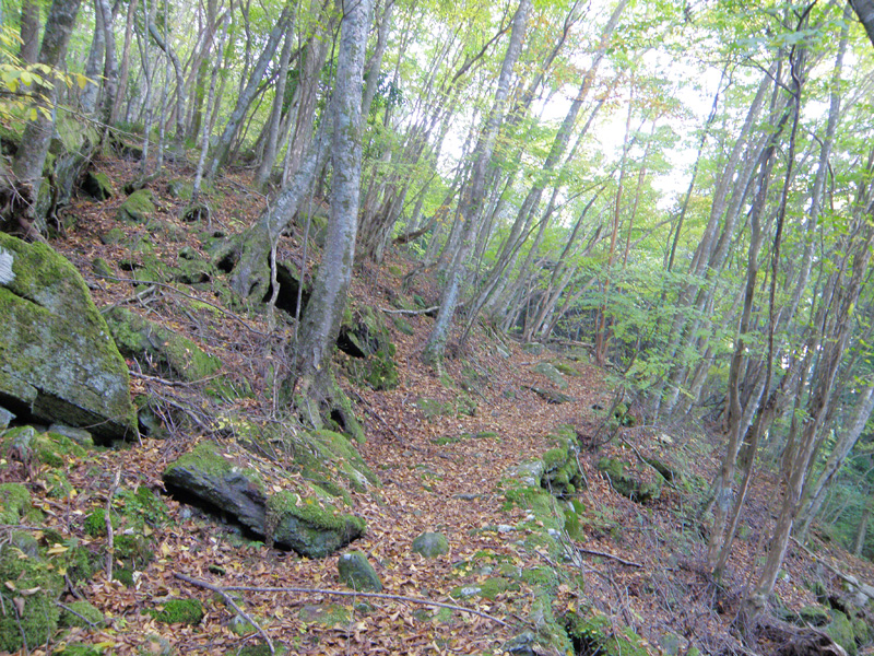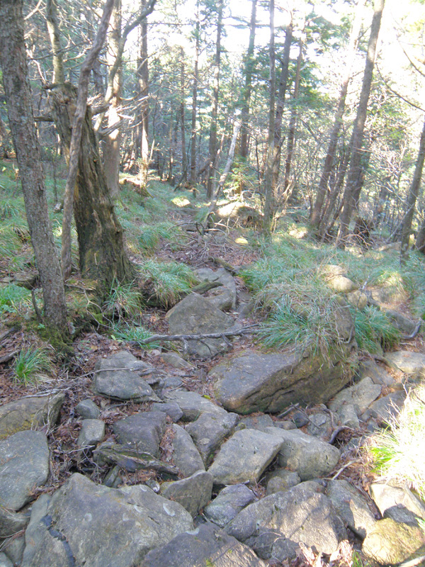 こちらは道が荒れている。 やっぱ登ってくる人が全然いないんだな…… 道自体は東赤石っぽく、石がごろごろした急な道。 ただ、南側とは違って、道自体がジメジメしてたり湿っている。