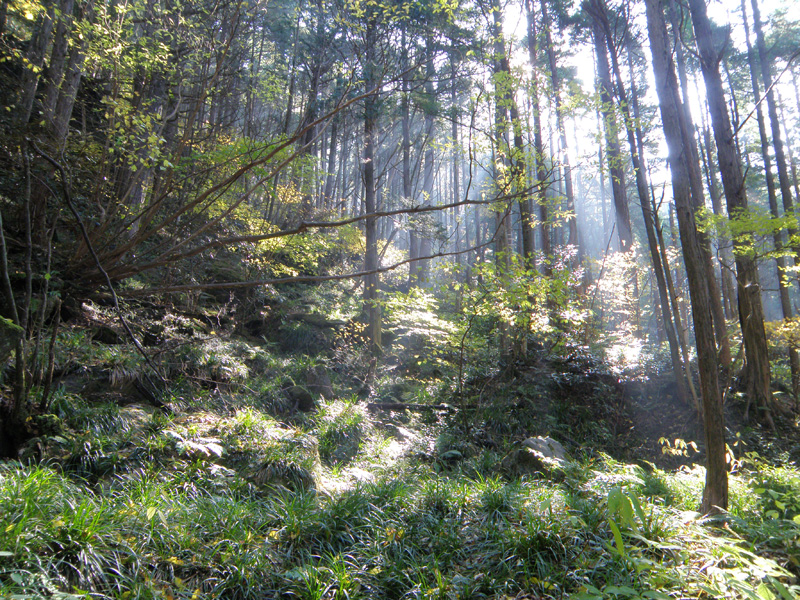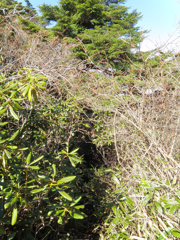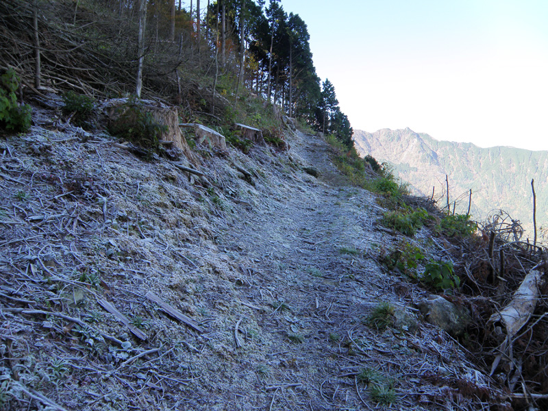 登山道に入り、荒れた道を歩く。 この道、あんまり人が通らないんだろうな。 目印のテープは1つも見当たらない。 踏み後のみが残る道。