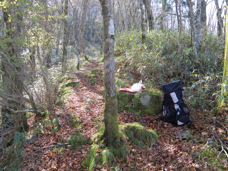 休憩できそうな場所を探していたら、うってつけな場所があった。 椅子になりそうな大きな岩、笹と樹木に囲まれていて風を防いでくれる。 そして日当たりが良いと。