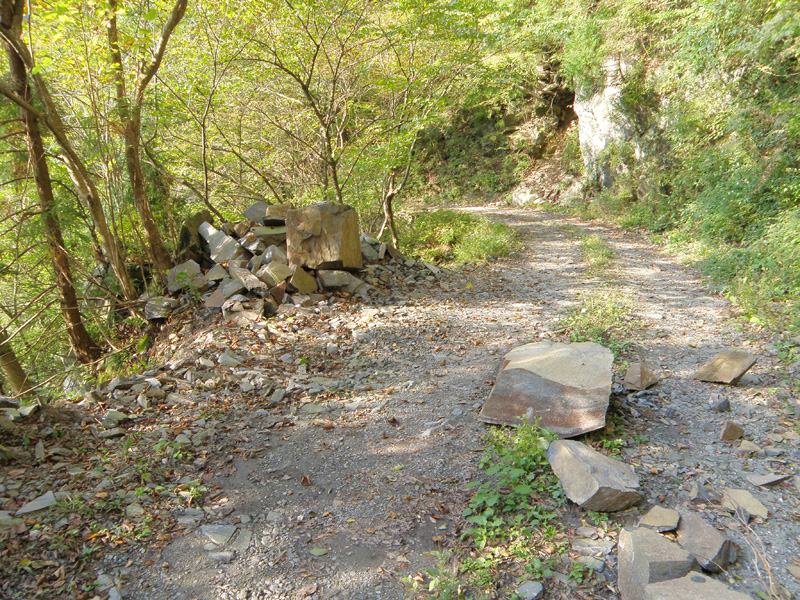 途中で落石の跡もあり、車が通るのがきつそうだ。 軽なら通れるだろうが、普通サイズのセダンだとどうかな…… 男が3人か4人くらいいれば、道のど真ん中にある石を少しずらすことはできるかもしれない。