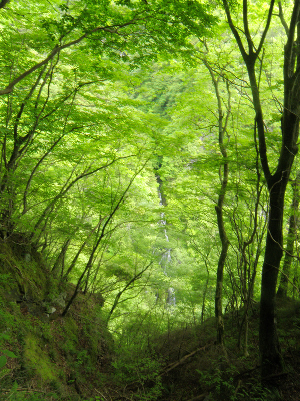 出だしは少し急な登りが続いたが、すぐに緩やかに。 少し歩くと瀬場登山口と合流。 先に進むと、右手から滝の音が。 八間滝だ。 いつもこの滝って遠くから見てるだけだけど、真下にいけるのだろうか? 道あるのかな……?