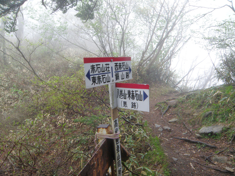 筏津登山口~赤石山荘~石室越~八巻山~東赤石山~東ルートで瀬場谷~筏津というコースだ。 初めての人がいるので、体力次第で、八巻山の岩がゴロゴロしたコースは断念するかも。