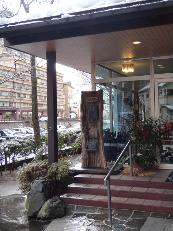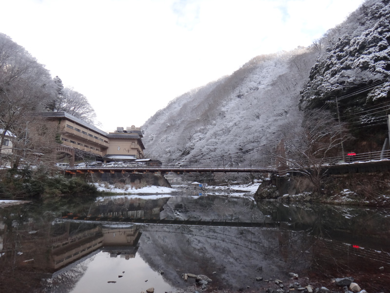 湯原温泉の旅館に到着したが、さすがに外は寒かった……
