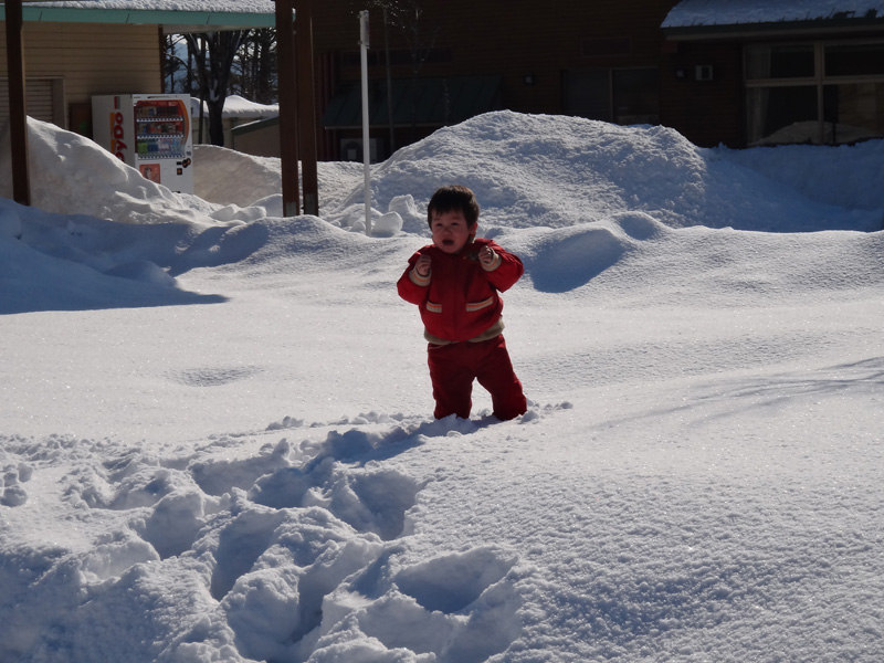 車道じゃない場所には、30~40cm程度雪が積もっているのでそこで遊ぶ。 長男は雪を怖がり、全然遊ぼうとしない。 一人で車内でお菓子を食べていた。