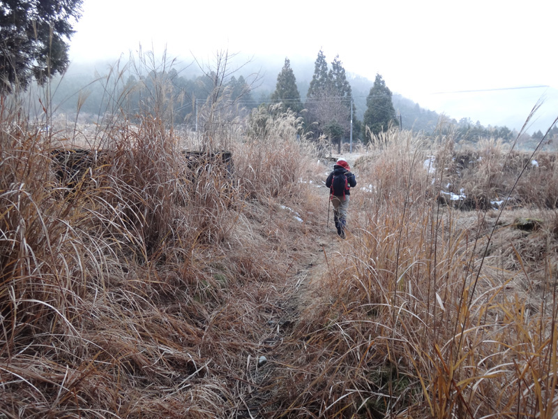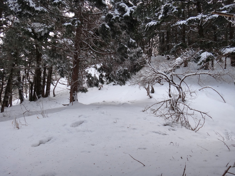 まずは、旧造林小屋まで。 全然雪が無い中歩いていく。 地面は濡れていて、落ち葉が微妙に凍っている。 石の上とかは滑るので気をつけなくては。