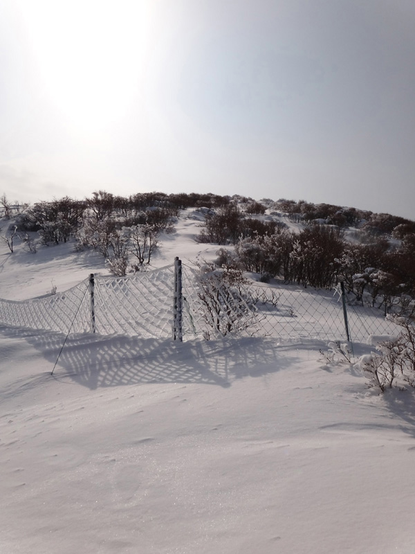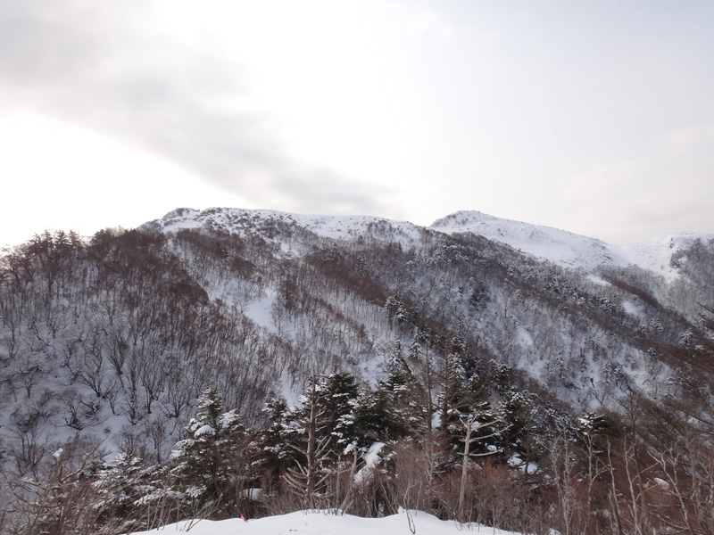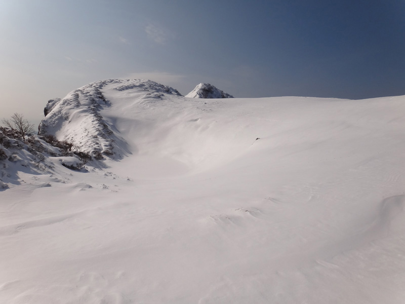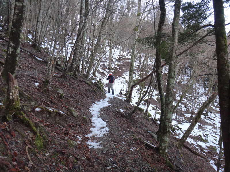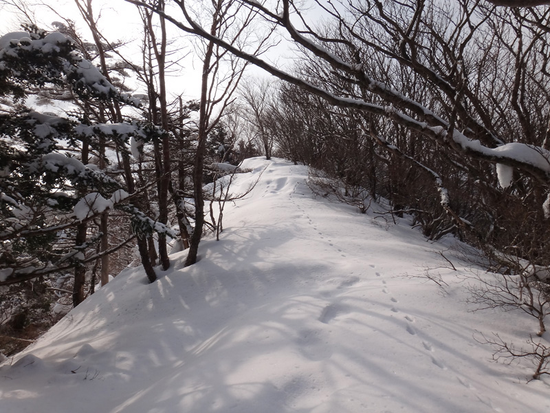 ここから少し下って、登りに入る。 この登りも思ったよりは雪が無かったかな。 急すぎて直登は出来ないので、ワイディングしながら登っていく。