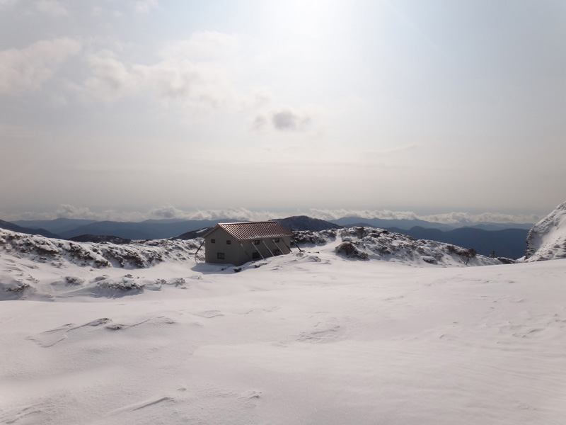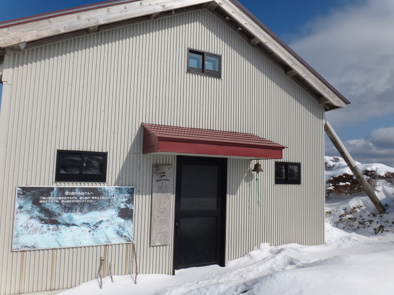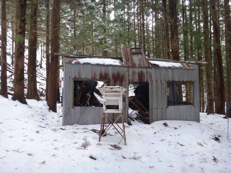 すぐに旧造林小屋まで到着。 ここで休憩。 ここまでは雪もほとんどなく暑かった。 が、休んでいて弱い風が吹いてるだけでも寒かったので、一度脱いだ服を着込む。 この先、傾斜がきつくなるし、半分凍った雪ではアイゼンが必須になるだろう。 ここでアイゼンを装着。