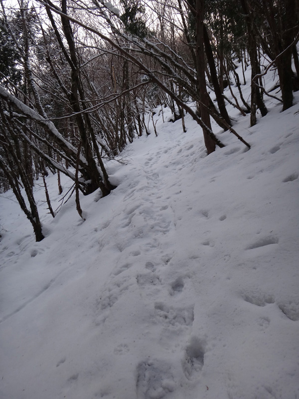 そして、難関に到着。 この急傾斜を一気に登っていく。 当然トレースはない。 が、この位置での積雪は30cm~40cm程度なので、行けるだろう。