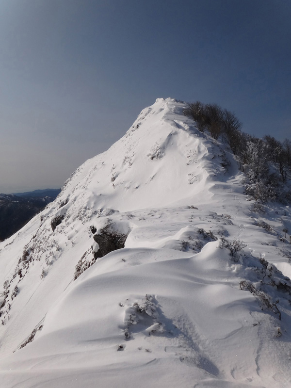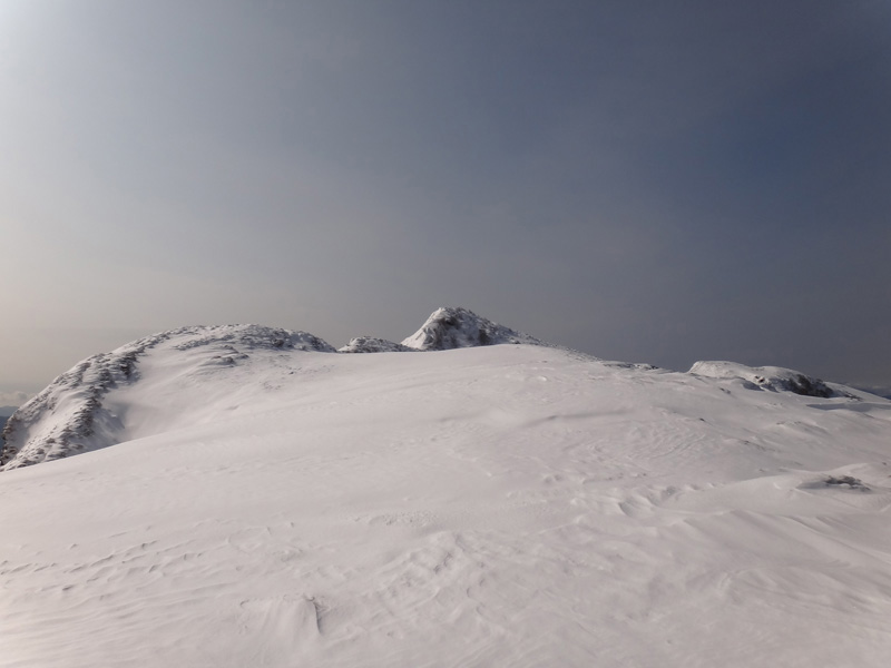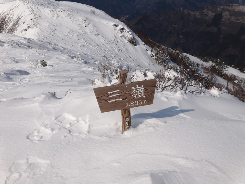 山頂前の登りを登り切って、三嶺山頂に到着。 山頂には男性が一人いた。 光石登山口から登ってきたらしい。 あちらは、こちら側より雪が多いだろうな。 夏でも歩いたことないルートなので、どんな感じなのかわからないけど……