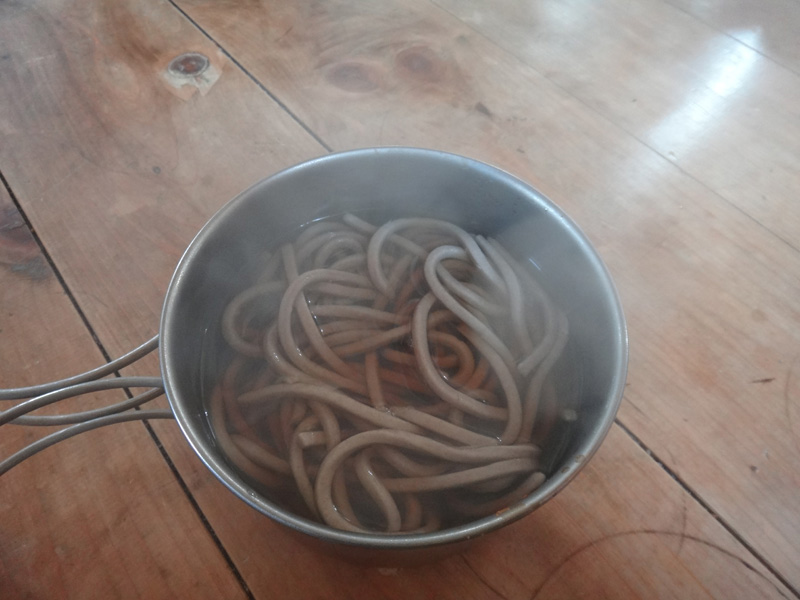 今日は蕎麦を持ってきた。 2つの鍋を上手く使って出汁と蕎麦をゆでる。 そして食す。 温かいな。 前回のラーメンよりは美味しかった。