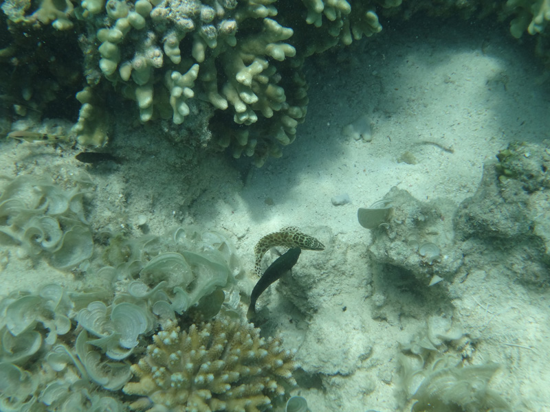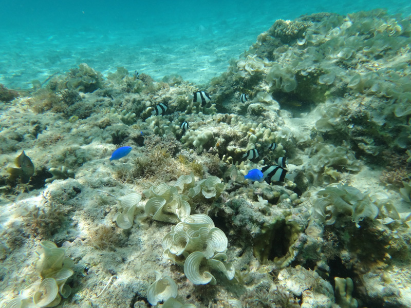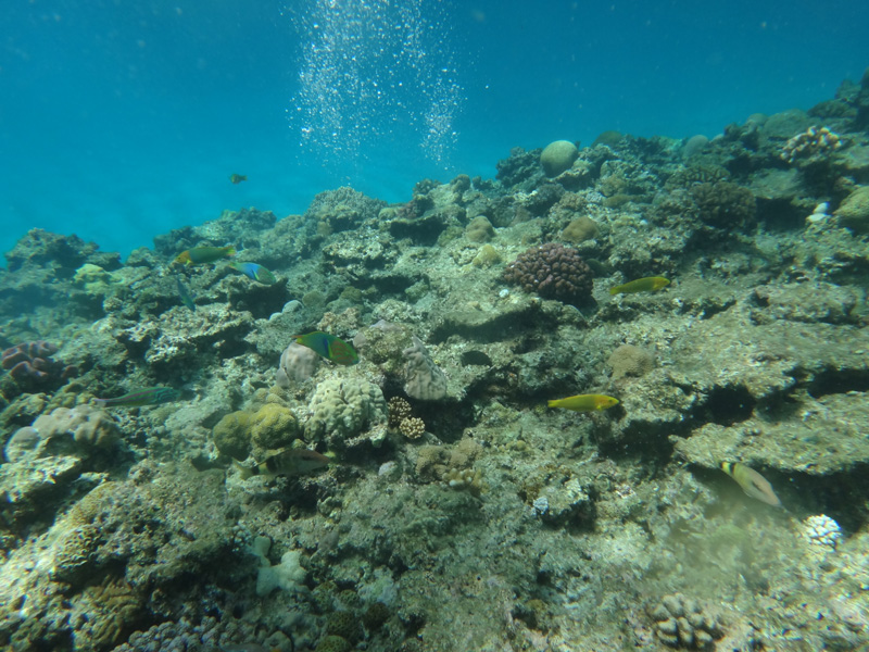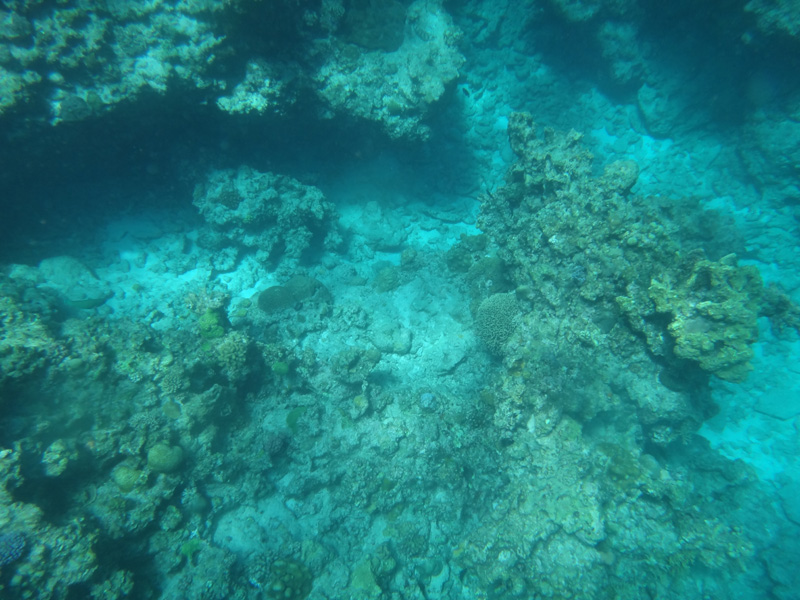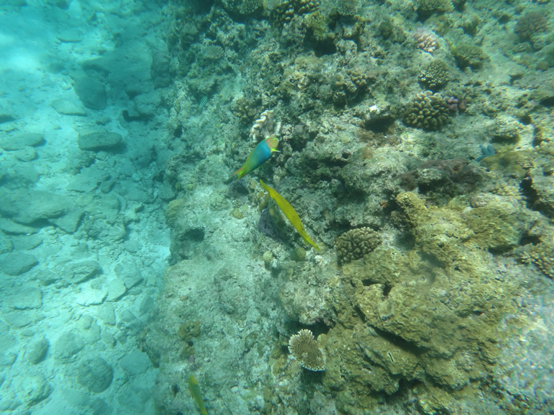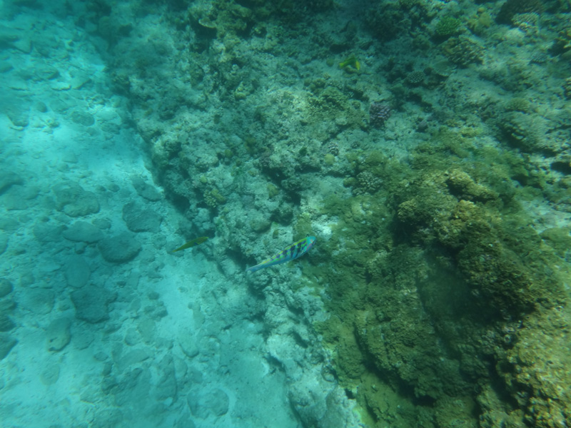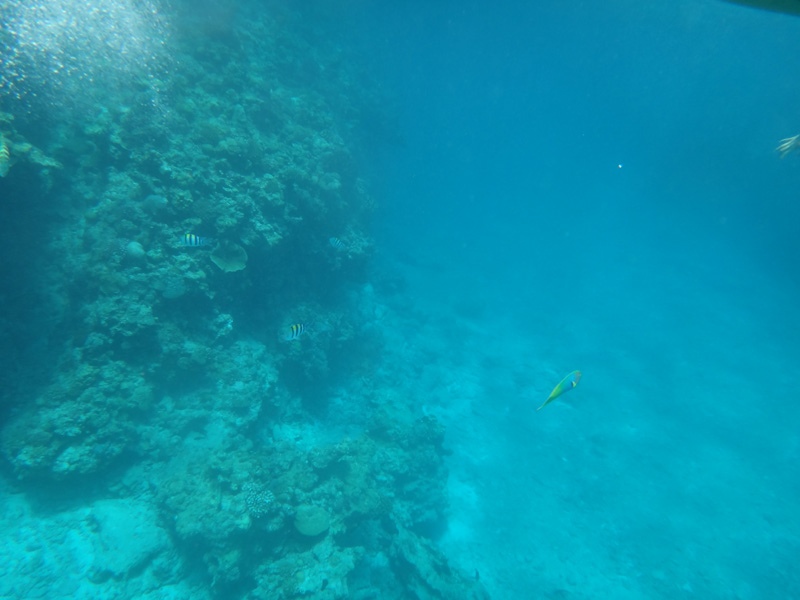 講習終わったら、再び船に乗って、シュノーケルのポイントまで移動。 ライフジャケット付けたまま、海に飛び込む。 深さは結構あるな、よく分からないが、軽く5mはありそう。 顔を付けたまま誘導される方向に泳いでいく。 綺麗な魚がたくさん泳いでいる。 まさに南国だ。 ひたすらあっち泳いだり、こっち泳いだりで、30~40分くらい泳いでいたのだろうか。 だいぶ疲れて、後半の方は結構寒かった。