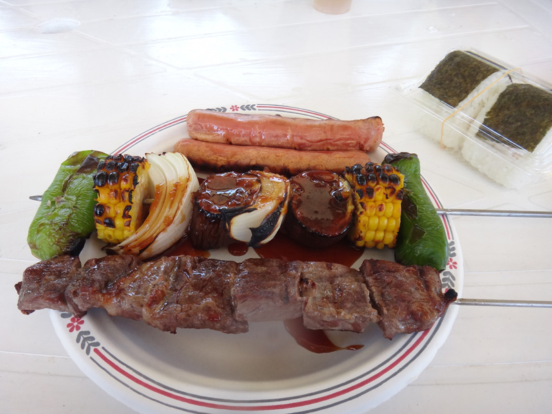 シュノーケルが終わったら、いったん島に戻り、お昼ご飯のバーベキューへ。 バーベキューというけど、配られたのはおにぎり2つと、串に刺さった野菜と肉だけ。