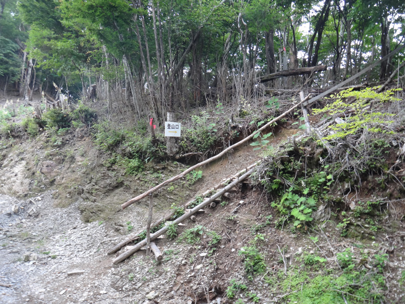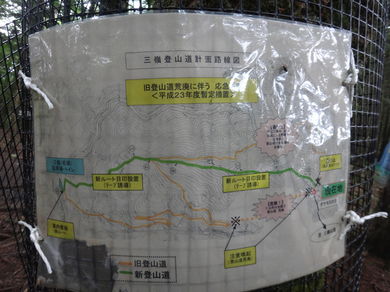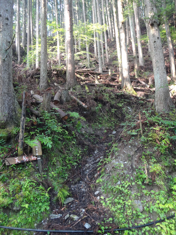 左手に折れると、今までの登山道。だが、秋の台風で通行することが困難になり、人が歩かないようになっていき荒廃したらしい。